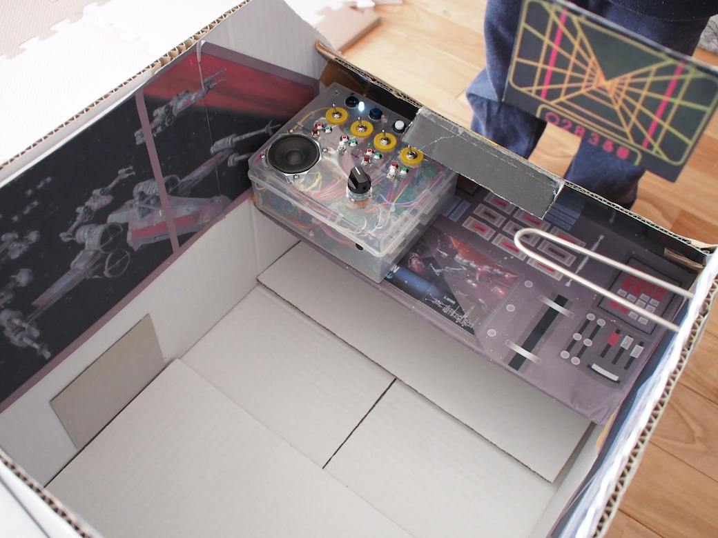 これを先日作った"段ボールX-WING"に設置、そこに息子が乗り込む。